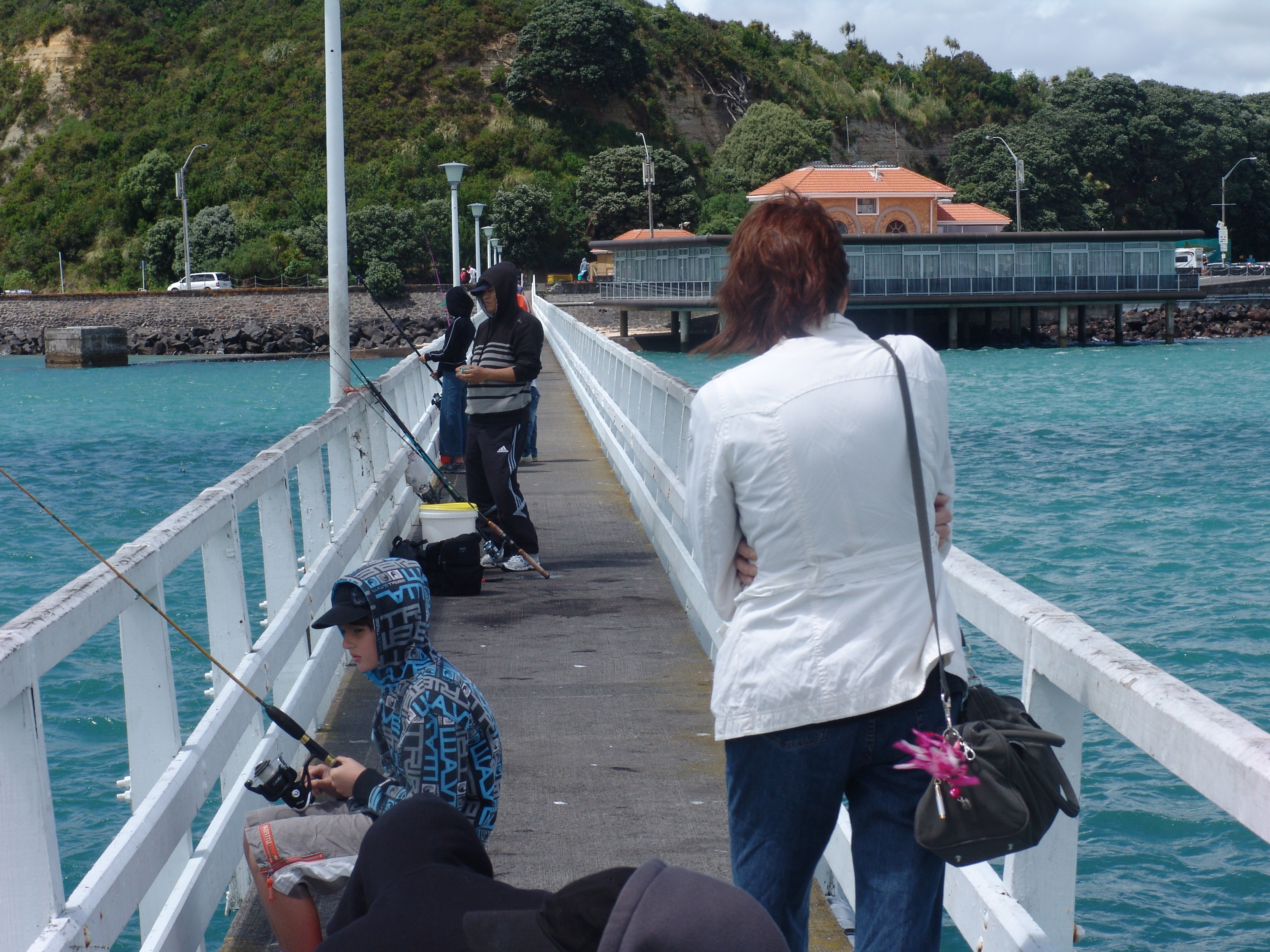 Na de haaien en Pinguins zijn we aan de overkant van de straat een steiger op gewandeld waarop veel vissers jong en oud het avondeten bij elkaar aan het hengelen was. Een mooi uitzicht op de skyline van Auckland aan de overkant van het water. Jammer dat het niet echt helder weer is en er ook nog een fris windje stond.