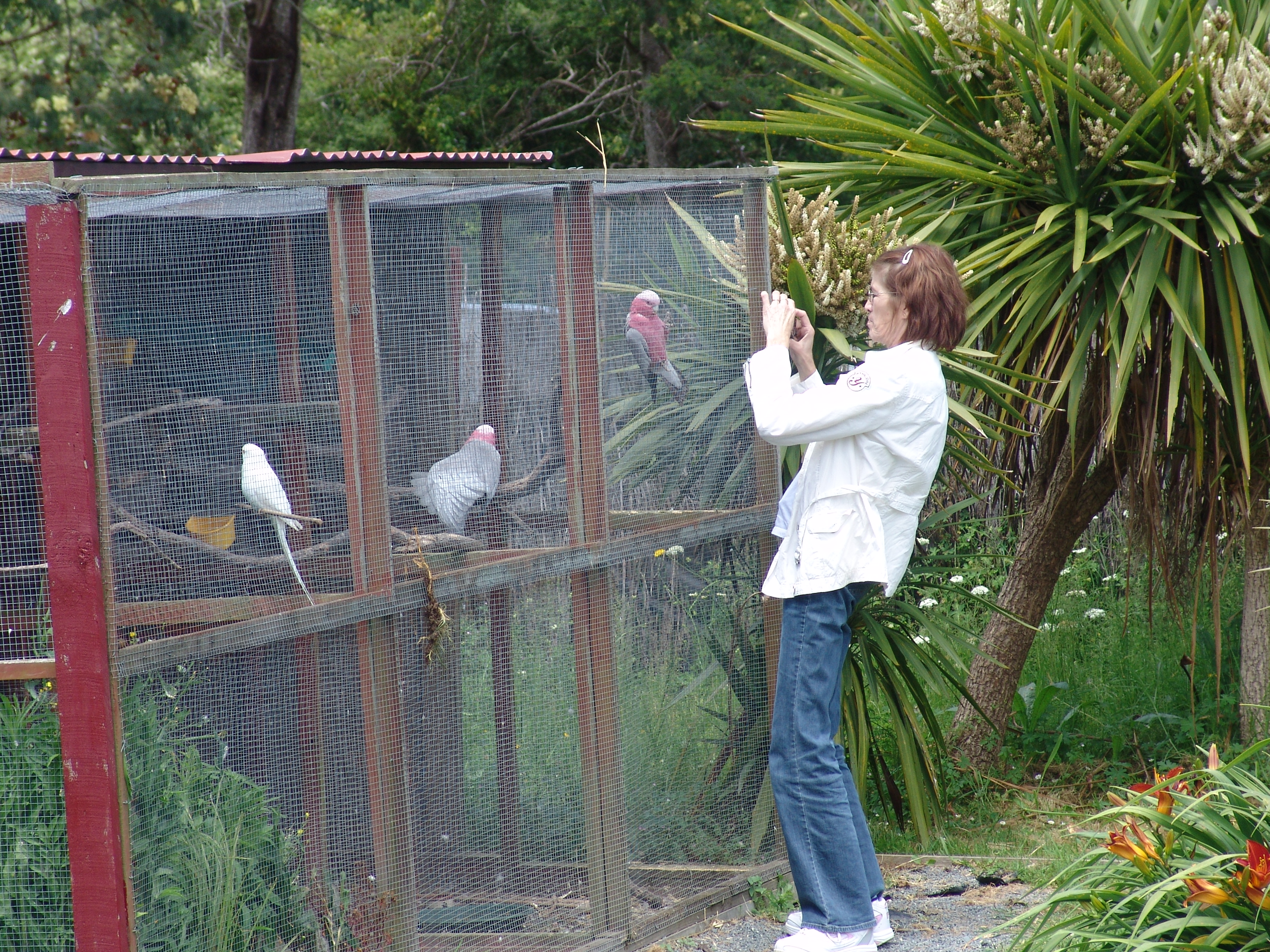 Onderweg zijn we gestopt bij een cafe annex restaurant voor een laat ontbijt. Een goede keuze, ze hadden sterke koffie en een lekkere bacon sandwichtoast met frites en met vermaak in de vorm van een paar grote vogelkooien met grote parkieten en een kip met kuikens. (later nodig voor de chicken sandwich die ook op het menu staat).
