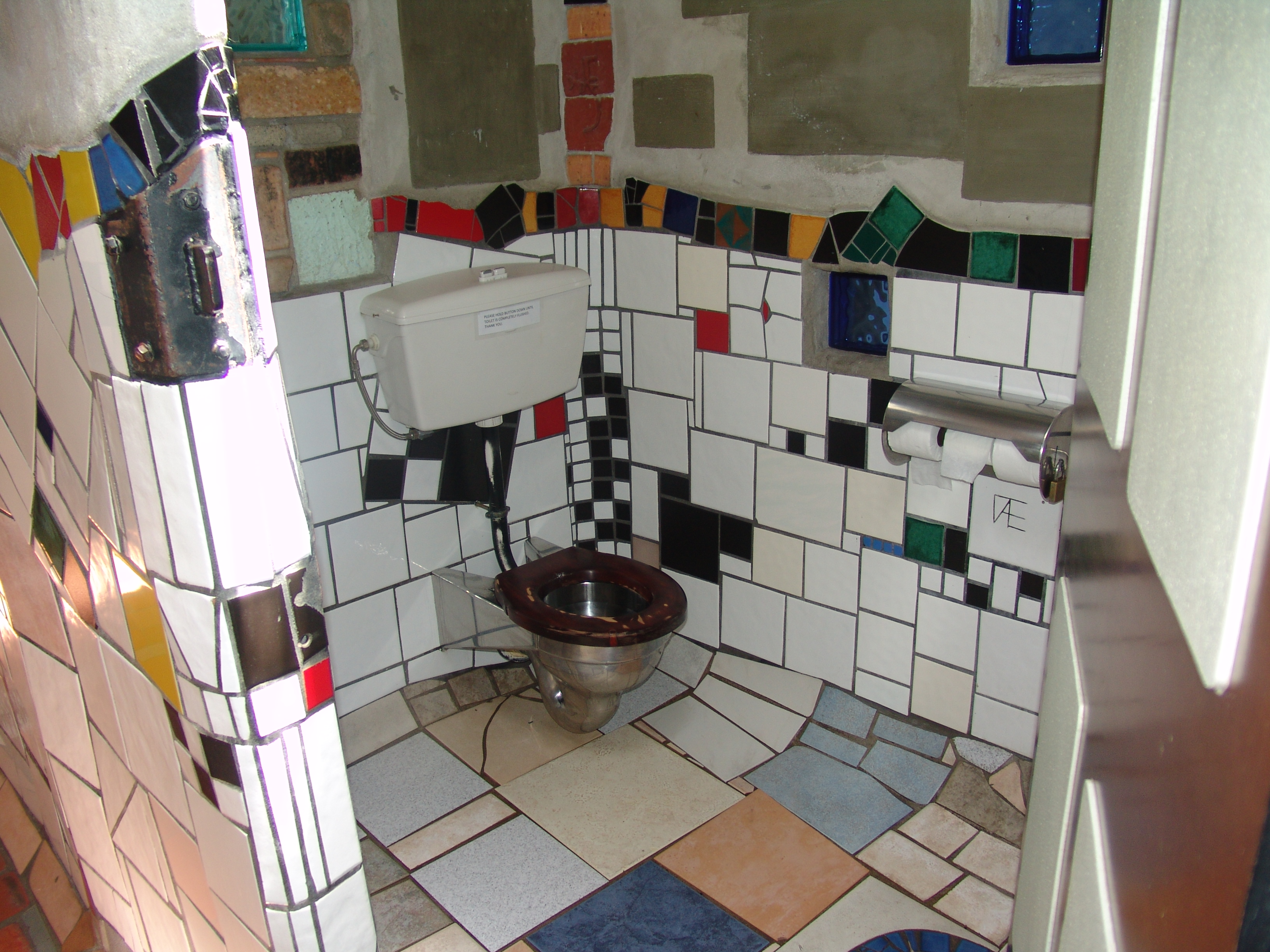 Daarna Kawakawa een absolute must vanwege de Hundertwasser toiletten. We waren Kawaka al weer uit voor we het merkten. Toch even terug gereden en de auto geparkeerd. We kwamen hier de eerste andere Nederlanders tegen. Verscholen in het winkelstraatje hebben we toch ’s werelds meest bijzondere toiletgroep gevonden. Heel mooi gemaakt met tegelmozaïek maar je moet er van houden.
